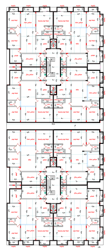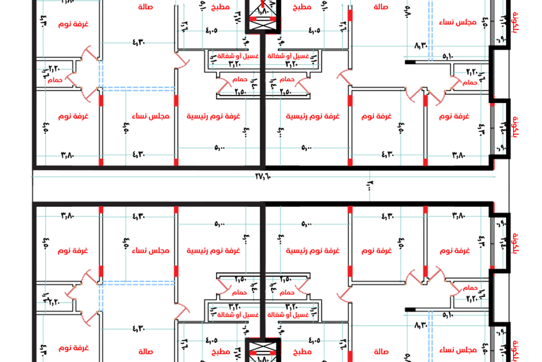 تتكون كل شقة من (6) غرف متنوعة وصالة ومطبخ وغرفة عاملة وغرفة غسيل.